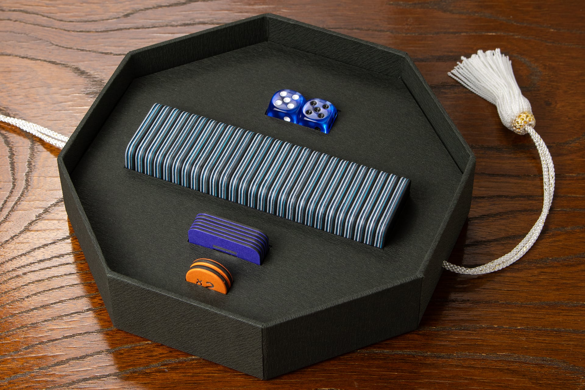 [Materials] Tiles: Paper (PP laminated); Markers, Chips, Instruction Sheet, Serial number certificate, Box: Paper; Dice: Acrylic, Furoshiki/Playmat: Polyester