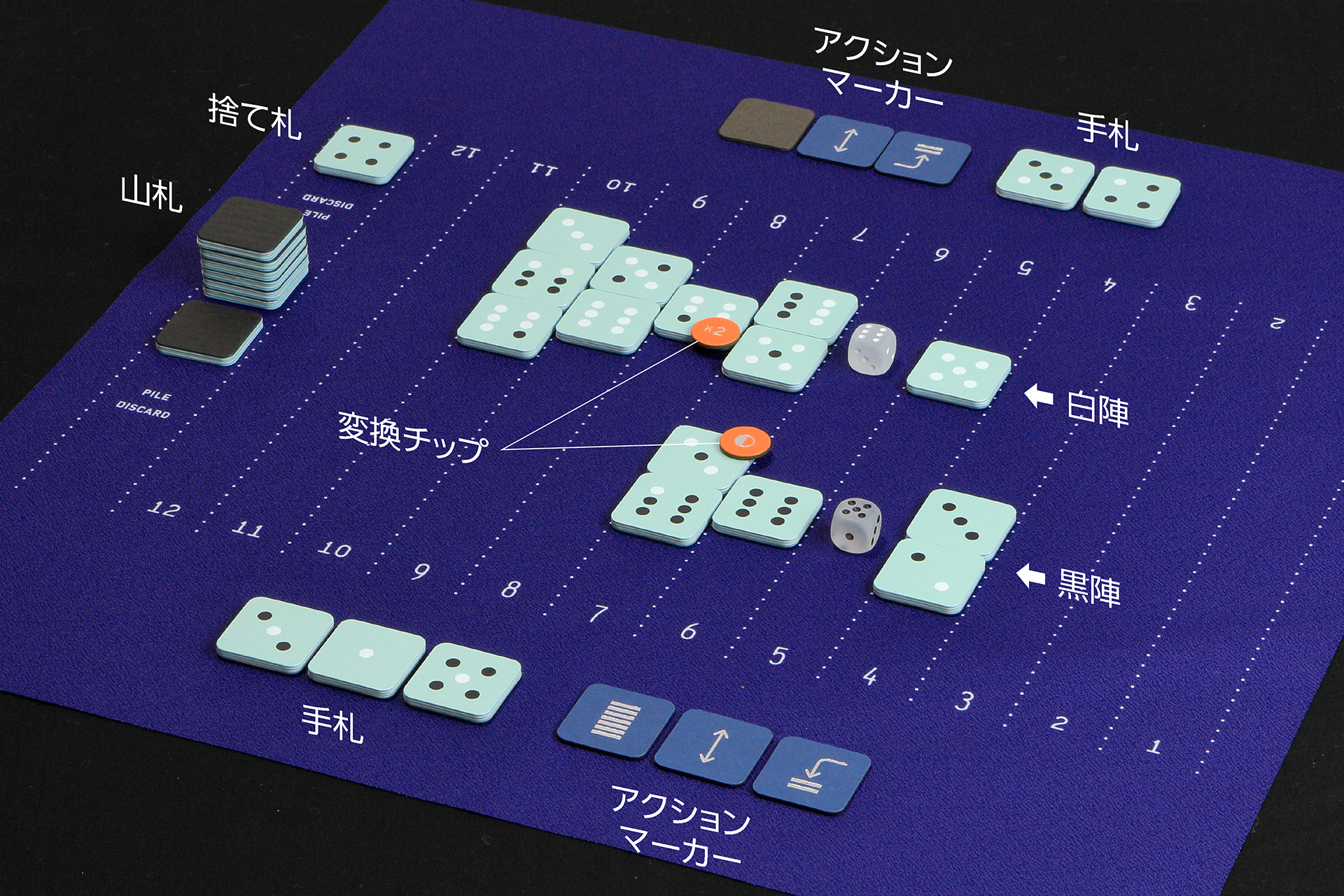 [Contents] 27 Dot tiles, 6 Action markers (3 types x 2), 2 Modifier chips, 2 Dice (White pips x 1, Black pips x 1), 1 Instruction sheet (JP, EN), 1 Serial number certificate, 1 Furoshiki/Playmat